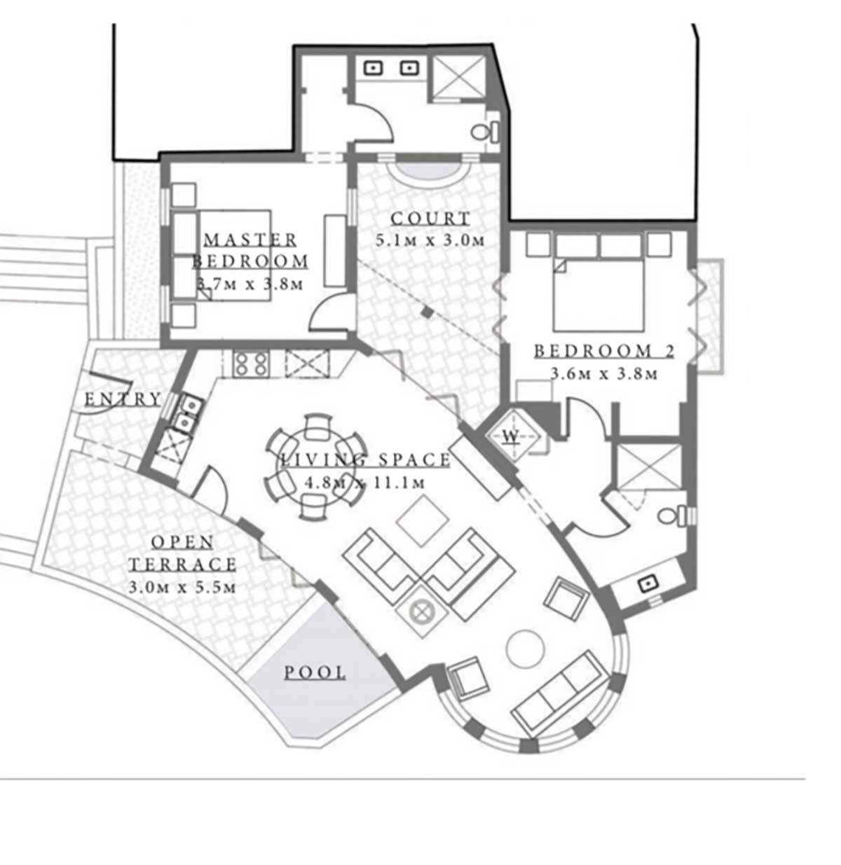 As you enter, you’re welcomed by a charming open terrace and your own private plunge pool, creating an instant feeling of relaxation and exclusivity.
