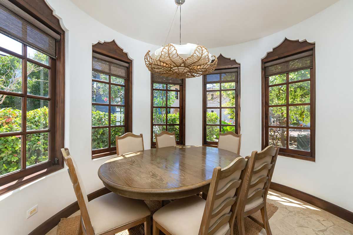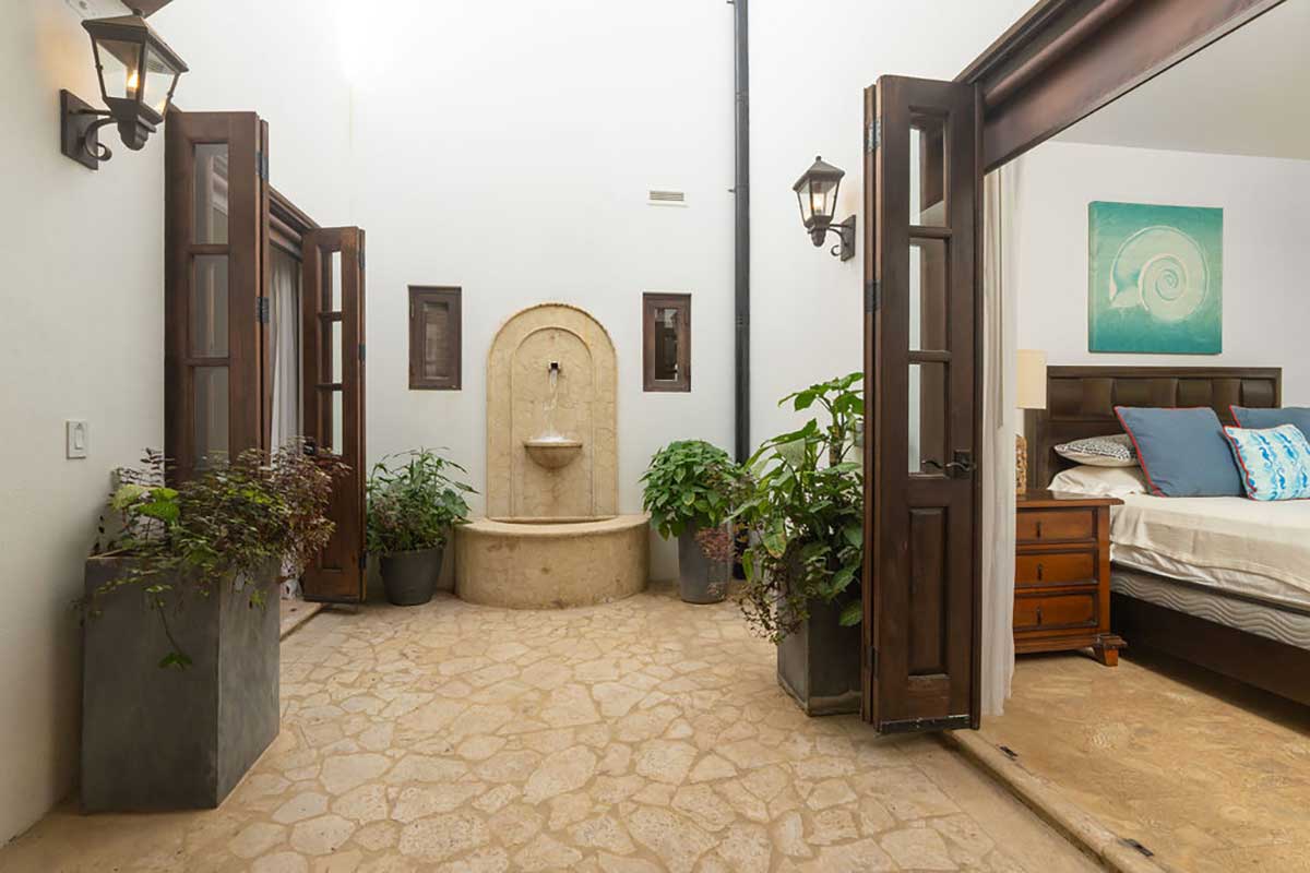 Inside, the home opens into generous living and dining areas that flow around an elegant interior courtyard, filling the space with soft natural light and a calming atmosphere. Thoughtful finishes, high-quality materials, and curated furnishings give the home a refined yet comfortable feel—perfect for everyday living or a vacation retreat.